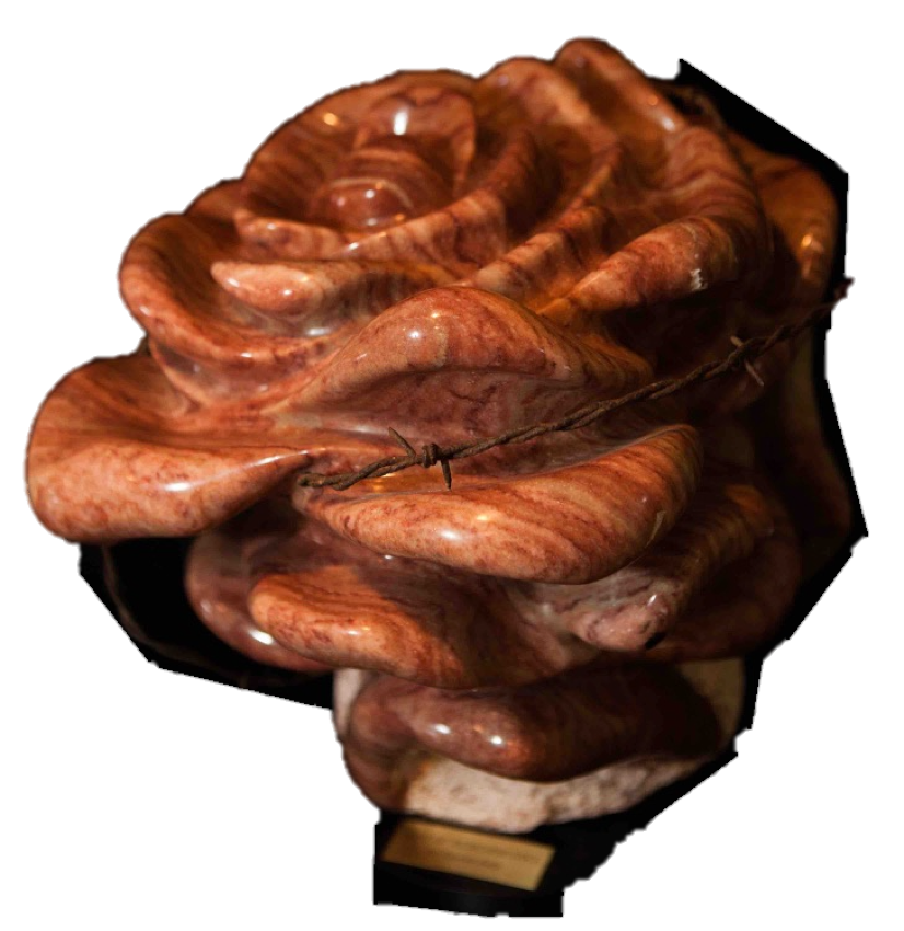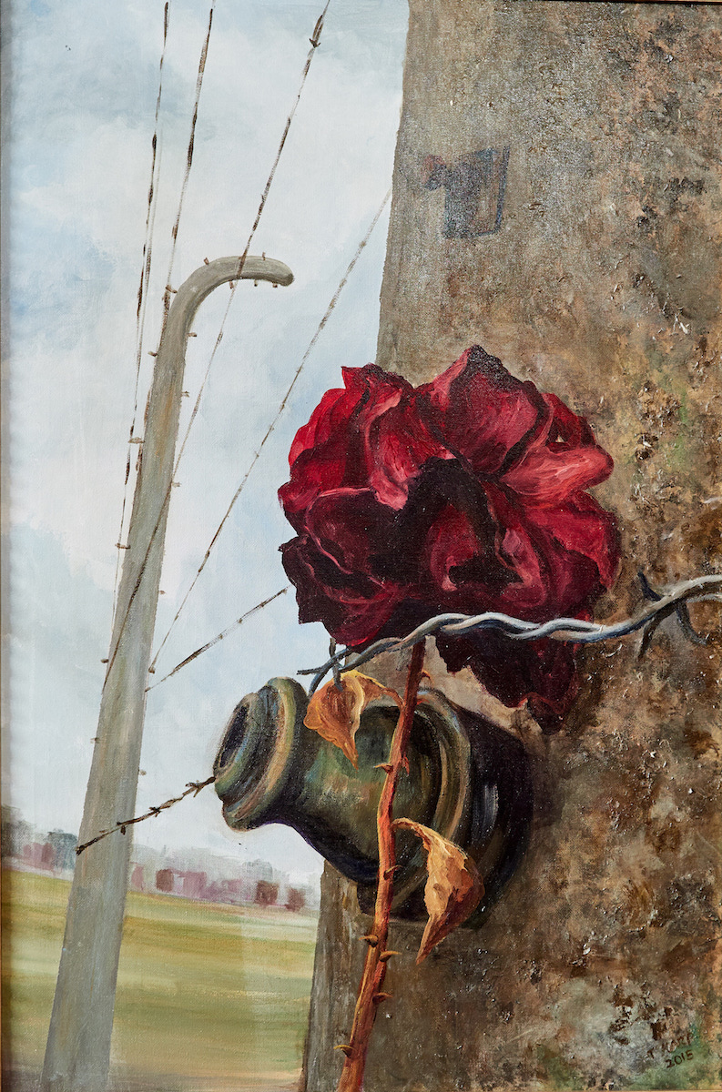 The inspiration for this piece came from a friend of mine who went to visit the camps to see what was left. During his trip, he took a photo of a dying rose left on a pole against barbed wire.